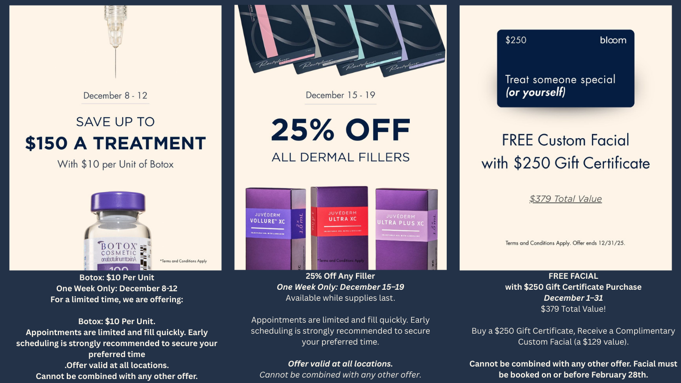 From December 8–12, enjoy Botox at just $10 per unit and save up to $150 per treatment. Between December 15–19, receive 25% off all Juvederm and Restylane fillers for a refreshed, youthful appearance.